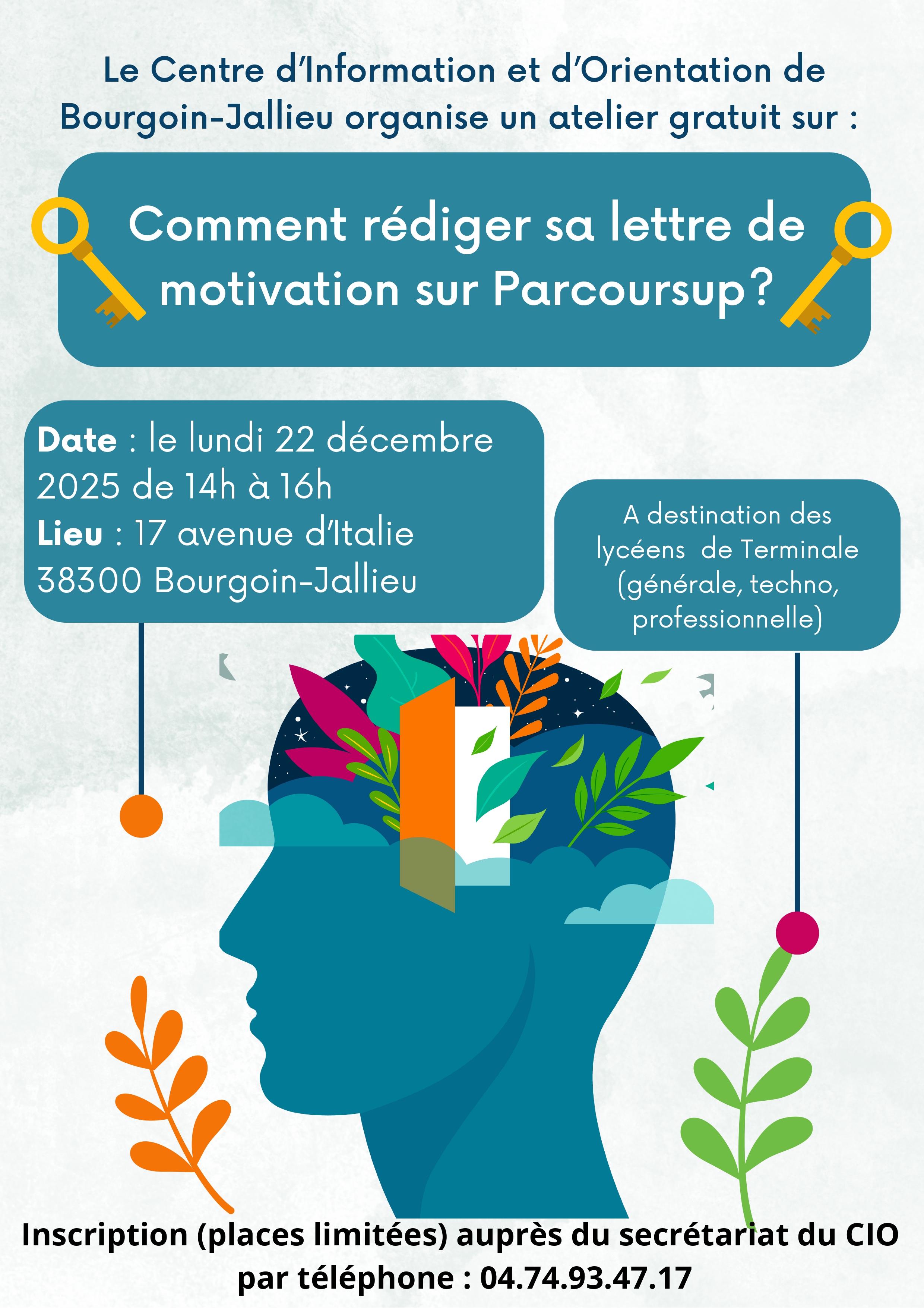 Dans le cadre de l’information et de l’orientation des lycéens du Nord Isère, le Centre d’Information et d’Orientation de BOURGOIN-JALLIEU organise un atelier thématique ; comment rédiger sa lettre de motivation sur Parcoursup, le Lundi 22 décembre