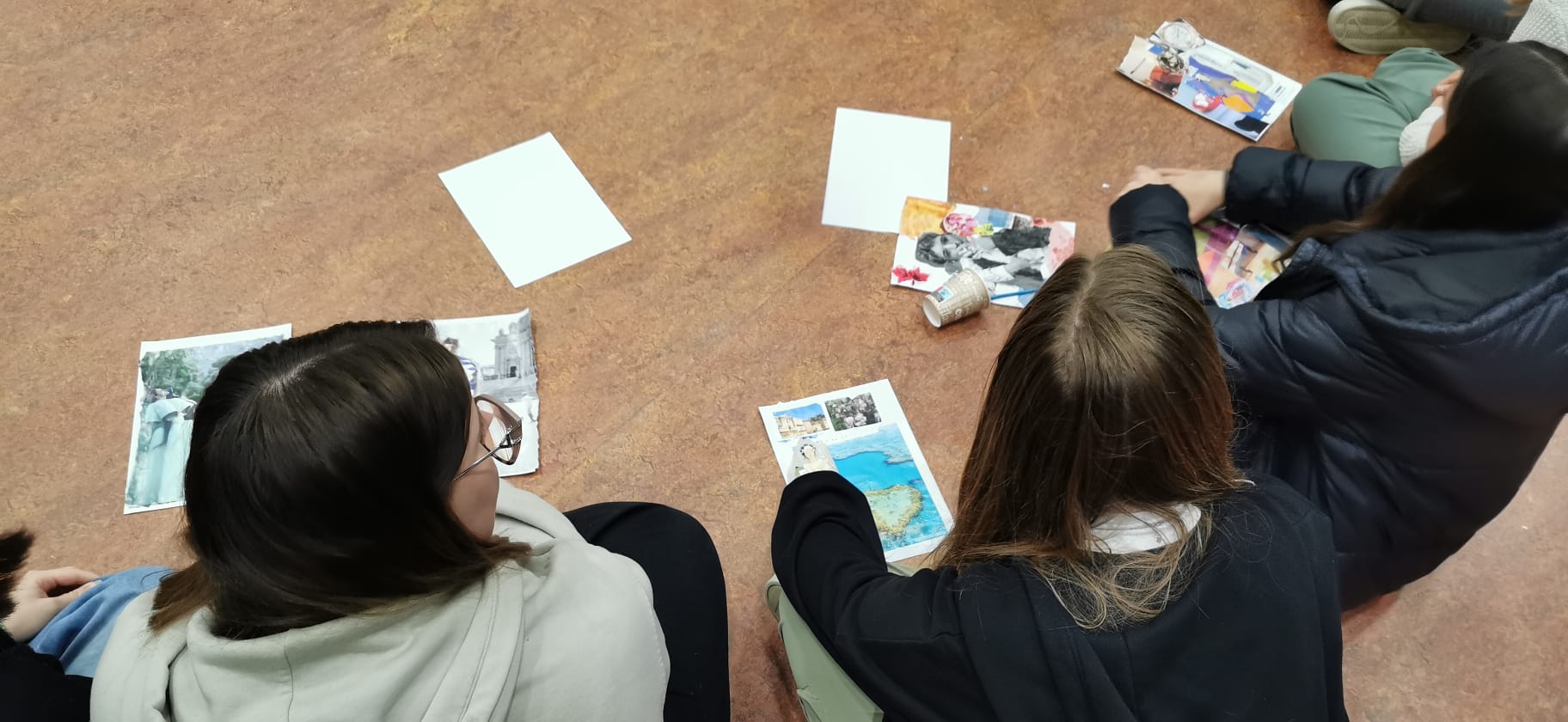 Lors de la troisième séance, les élèves ont pris part à un exercice de cohésion de groupe et d’appropriation de l’espace avec un jeu théâtralisé du chat et de la souris. Ils ont ensuite réalisé des collages et participé à un exercice d’écriture sous forme de cadavre exquis long. Il s’agissait de travailler l’expression écrite.